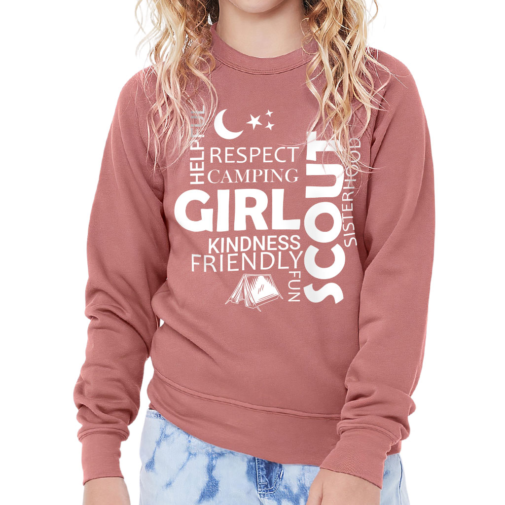 This remarkably soft pullover crewneck sweatshirt lends itself to daily wear and year-round layering. Girl Scout Kids’ Raglan Sweatshirt features ribbed cuffs and a waistband, a crew neck, and a fashion-forward fleece fabrication.