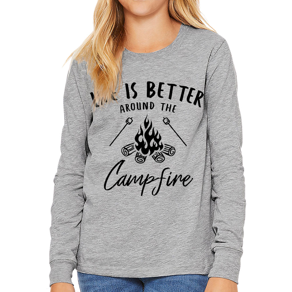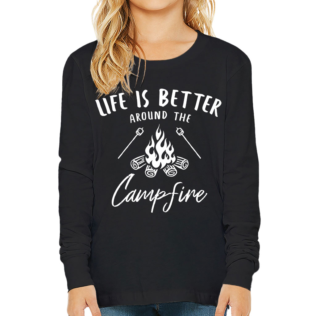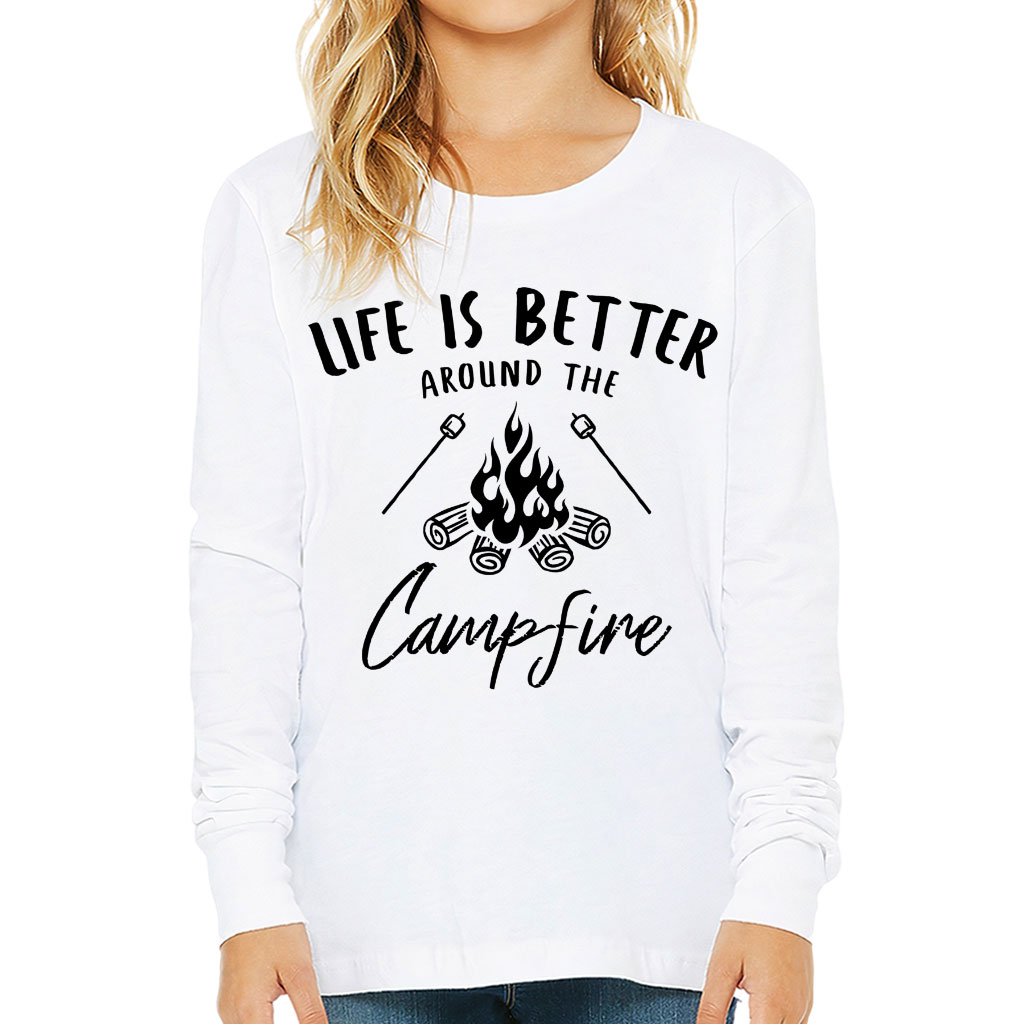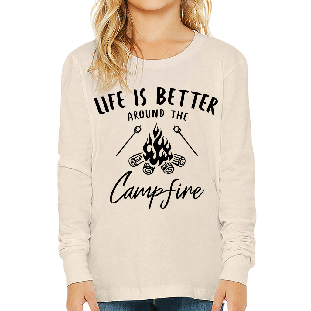 Life Is Better Around the Campfire Kids’ Long Sleeve T-Shirt – Present for Girls – Hiking Print Stuff